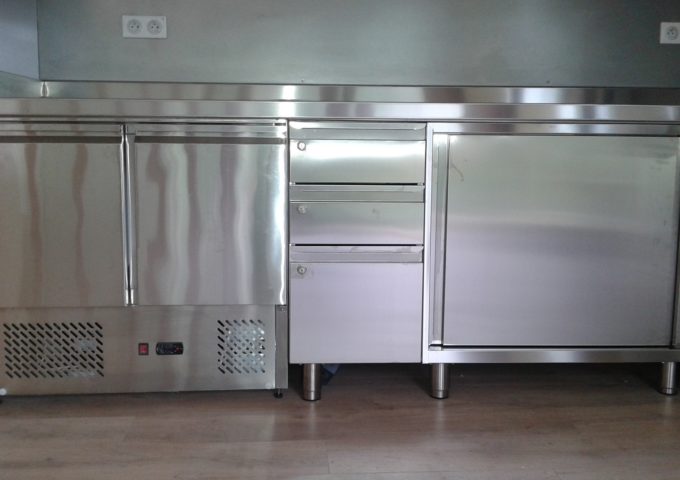 Vous retrouverez tous les plans de travail de type central, tables, chariots, placards ouverts ou fermés, meubles neutres ou chauffants, étagères murales ou casiers, tables de dressage et chauffe plats, dosserets de fourneau ou aménagements spécifiques, tout inox :